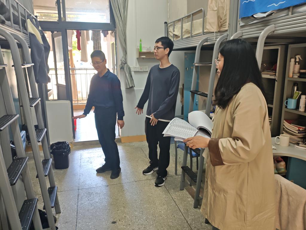 走访宿舍时,老师们耐心倾听学生在学习和生活中遇到的困难,了解同学们的所思所想、所急所盼,并回应学生关切问题,让学生更加安心学习。